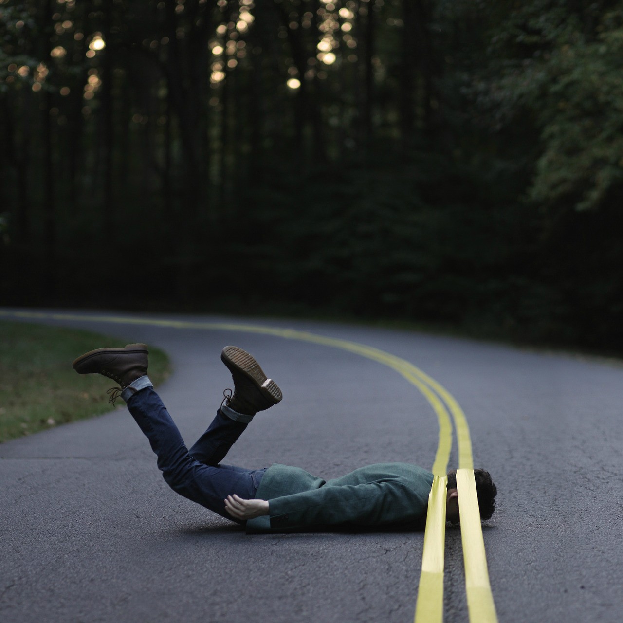 This is an example of an image that has been manipulated through software. The image was likely taken with the man laying on the floor over the yellow lines and the yellow tape glued down onto the yellow lines so it appears they come out of the yellow lines on the floor. The person who made this probably used a spot healing or clone brush to turn the yellow lines on the floor into concrete so that it appears that the yellow lines come out of the floor, over his head and back into the floor again.